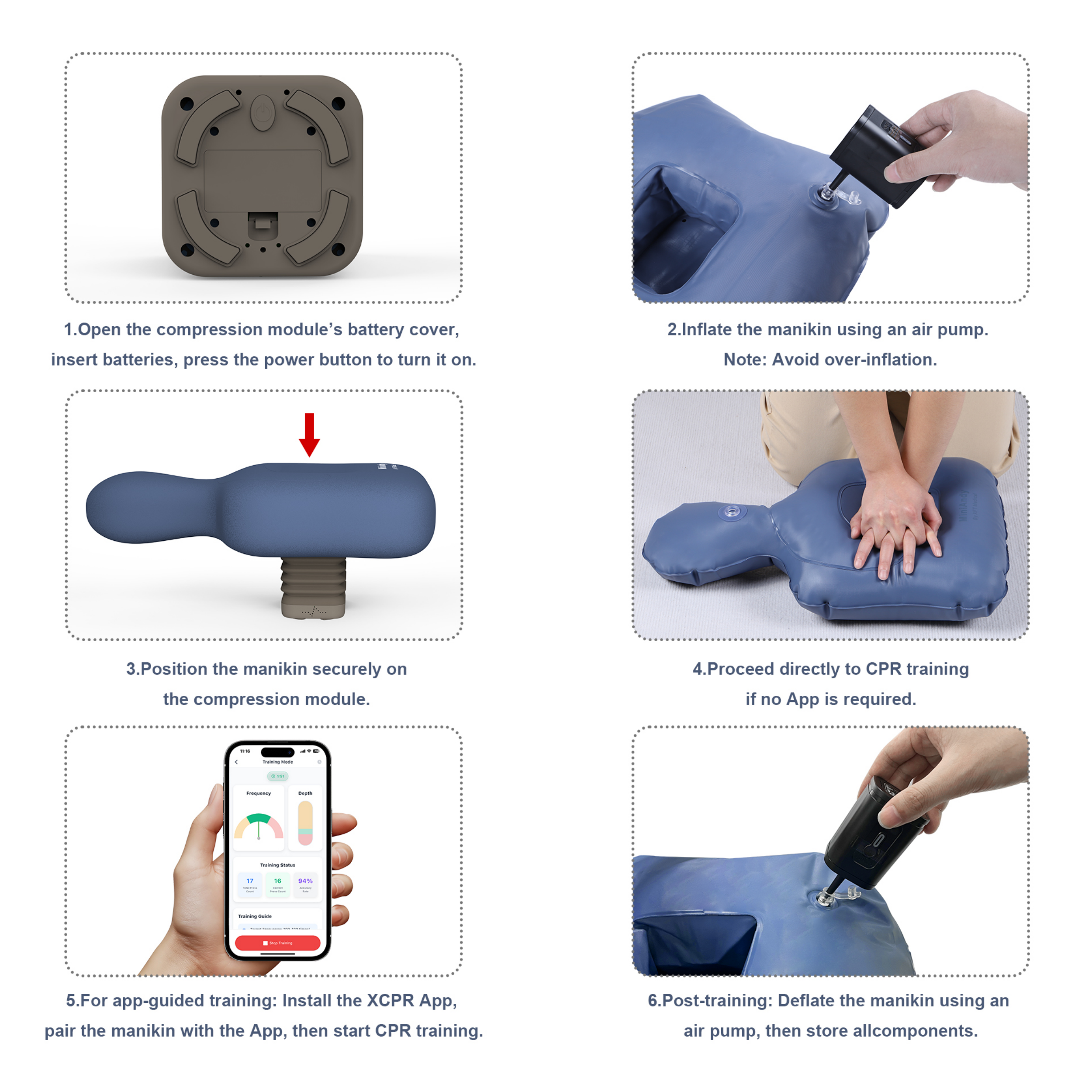 It comes with a compression data module that connects to a smartphone via Bluetooth, allowing you to record and track training performance. Real-time audio feedback provides guidance on compression depth, rate, total compressions, and correct compressions. The system features both student and instructor modes, supports multiple device connections, and enables group training or competitive practice.
